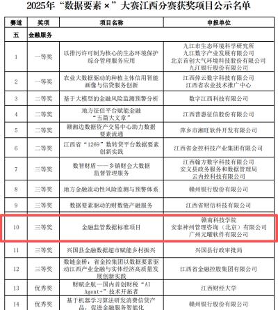 近日,2025 年 “数据要素 ×” 大赛江西分赛落幕,安泰神州管理咨询(北京)有限责任公司(以下简称 “安泰咨询”)与广州元耀软件有限公司、赣南科技学院联合研发《金融监管数据标准项目》,斩获金融服务赛道三等奖。